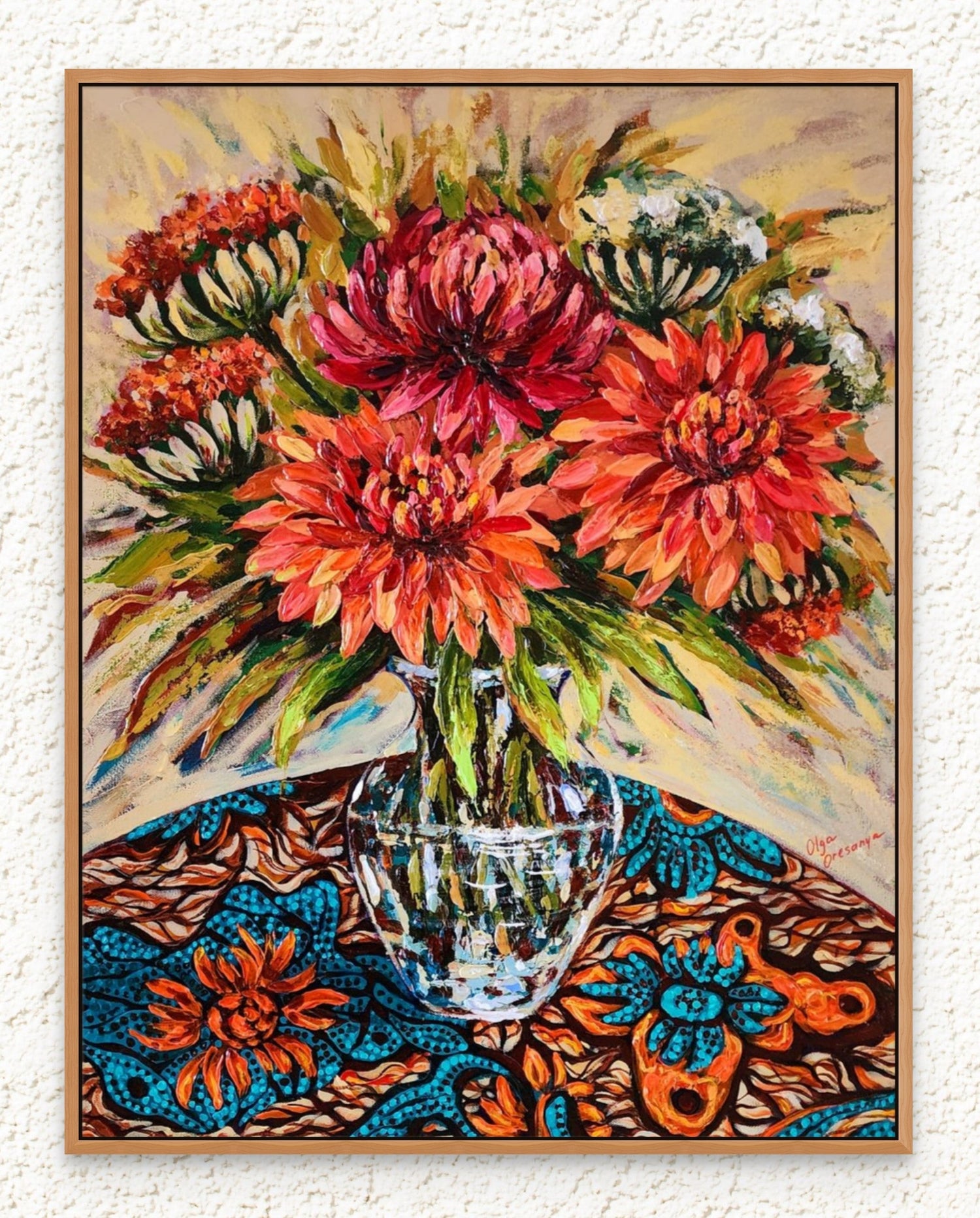 My work is characterized by vibrant colours and rich textures, elements that are integral to my creative expression. I believe that original paintings enhance the charm and personality of any interior space, making them unique and inviting. Additionally, I am fascinated by Nigerian Ankara fabrics, and I frequently incorporate their bold patterns and colours into my still life pieces.